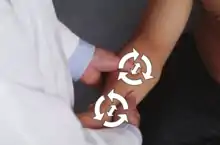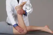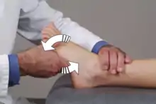 | Posterior Fibular Head Post-Isometric Muscle Energy: The patient is supine. The physician places the hand closest to the knee in the popliteal fossa so that the metacarpophalangeal joint of the index finger approximates the posterior fibular head and, with the other hand, externally rotates the patient's foot until the restrictive barrier is reached. The patient is told to internally rotate the foot and the physician will resist the motion with an isometric counterforce. In each respective iteration, the patient is taken further into the restrictive barrier. | ![]() Posterior Fibular Head Post-isometric Relaxation Muscle Energy |