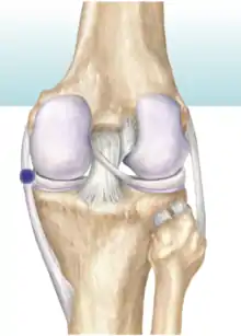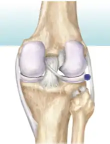 The knee is stabilized by a pair of cruciate ligaments; these are also classified as extrinsic ligaments of the knee. The anterior cruciate ligament (ACL) spans the lateral condyle of femur to the anterior intercondylar area. The ACL is especially important because it prevents the tibia from being pushed excessively anterior; it is often torn during torsion or bending of the knee. The posterior cruciate ligament (PCL) extends from the medial condyle of femur to the posterior intercondylar area. Injury to this ligament is uncommon but can occur as a direct result of trauma. This ligament prevents excessive posterior displacement of the tibia. The patellar ligament (also called the patellar tendon) connects the patella to the tuberosity of the tibia.