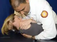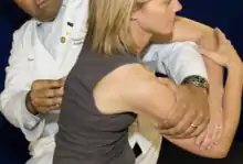 | Seated HVLA (Full Nelson): The patient is seated on the table, while the physician stands behind the patient. The patient is instructed to interlock their hands behind her head. The physician weaves their arms from anterior to posterior through the opening created by the patient’s arms, and interlocks their hands on top of the patient’s hands. The patient is instructed to bring their elbows together and relax and look up toward the ceiling. The physician then brings the dysfunctional transverse process or apex of a group dysfunction into contact with the physician’s sternum. The physician instructs the patient to take a deep breath in and out. At the end of exhalation with the physician’s knees bent, the physician exerts a quick but gentle thrust superiorly and posteriorly from their legs. | ![]() Full Nelson |