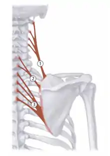 | Rhomboid minor | C6-C7 spinous processes | Medial border of scapula | Medial and upward movement of scapula | Dorsal scapular nerve (C4-C5) | ![]() 2 - rhomboid minor |
