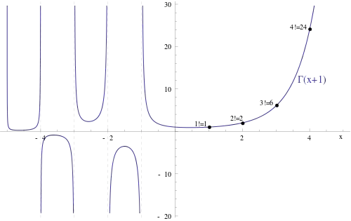 As you can see, in the above plot the Gamma function also has values on negative numbers. This is because what is plotted above is some sort of a natural continuation of the Gamma function which one can construct using complex analysis.