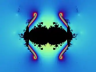 Mandelbrot set constructed using two different critical points; shows boundary in the upper half part and continuous colouring