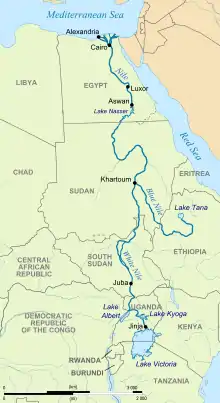 The Nile is a river in Africa. It is the longest river on Earth, about 6,650km, and flows into the Mediterranean Sea. Many different kinds of animals live in or near the waters of the Nile, including crocodiles, birds, fish and many others. People use the river water for everyday use, watering crops and other jobs.