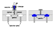 When the mold opens, the finished part is pushed out by a number of ejector pins shaped like flat headed pins.The ejector will pushes out the products from the mold after cooling phase