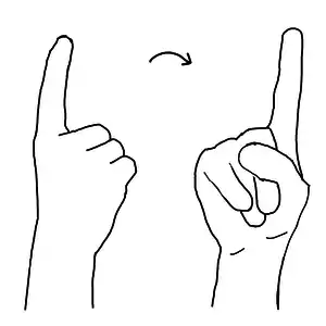 First, make a fist and extend your index finger, back of the hand facing forward. Then twist your hand so that your palm faces forward.
