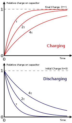 A diagram to show how the size of a capacitor affects its charging/discharging. A relative charge of 1 means that the capacitor is fully charged. 0 means it is fully discharged. The time constant, τ, is a measure of the rate of charging or discharging.