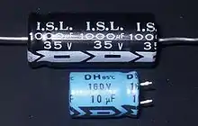 Axial (top) and radial (bottom) electrolytic capacitors.