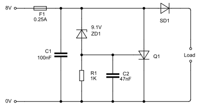 - Fuse F1 is the fuse that blows if the current drawn by the circuit significantly exceeds 250mA. This can be increased as needed, but make sure the thyristor Q1 has a higher current rating than the fuse. Also make sure the power supply can supply enough current to blow the fuse, as a current limited supply may fail to, and could overheat if the circuit is triggered.