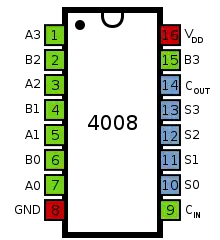 The 4008 is a 4-bit full adder that takes two 4-bit binary numbers, A[3:0] and B[3:0] and carry-in signal, Cin and adds them to produce a 5-bit result, made up of a sum, S[3:0] and a carry-out.
