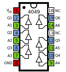 The 4049 is a member of the 4000 Series CMOS range, and contains six independent NOT gates, each with two inputs. The pinout diagram, given on the right, is the standard two-input CMOS logic gate IC layout: