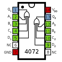 The 4072 is a member of the 4000 Series CMOS range, and contains two independent OR gates, each with four inputs. The pinout diagram, given on the right, is the standard four-input CMOS logic gate IC layout: