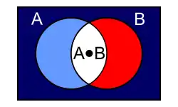 If we do the same trick with X again, we see that it must NOT be in both A AND B. Therefore it must be in the light blue, dark blue or red regions, and not in the centre. We can now say that X is either not in A, not in B or not in either. This is the same as saying that X is NOT in A OR NOT in B (using the logical kind of "or"). Therefore,