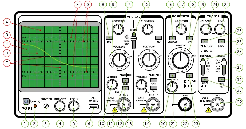 11 is the AC/DC toggle. When set to AC, any DC component of the voltage is filtered out by switching a capacitor in series with the input signal, leaving just an AC voltage. This is useful when the DC component swamps the AC component, making it either too small to see or driving it off the top of the screen. When set to DC, the signal is displayed as is.