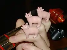 In "They're Rarely Too Young... and Never Too Old to Twinkle!" by Kay Collier Slone, a photo shows a 2-year-old girl with something like a violin under her chin which turns out to be a box of Crackerjacks with the candy still inside (when you shake it, it sounds like a rattle) and a long bar or slat of wood taped to the box. Someone in the Madison, WI Suzuki program thought up this idea to take care of a younger sibling with "violin tendencies", i.e. one who wants to get her hands on an older sibling's $100 instrument, an uncomfortable family situation.