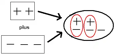 The situation gets a bit more complicated when one of the numbers to be added together is negative and the other is positive. Let's say we want to add positive two (+2) to negative three (-3). If we draw the plus and minus signs, we can pair up each positive sign with one negative sign and then they cancel each other out. This leaves one negative sign, though, meaning that +2 plus -3 equals -1: