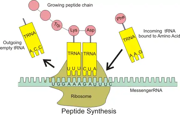During protein synthesis, tRNA brings amino acids to the ribosomes in the correct sequence for polypeptide synthesis. tRNA recognizes both the amino acid and the mRNA codon. This dual function is reflected in its thee-dimensional structure: one end contains a three-nucleotide sequence, the anticodon, which is complementary to one of the mRNA codons; the other end is the site of amino acid attachment. Each amino acid has its own aminoacyl-tRNA synthetase, which has an active site that binds to both the amino acid and its corresponding tRNA, catalyzing their attachment to form an aminoacyl-tRNA complex.