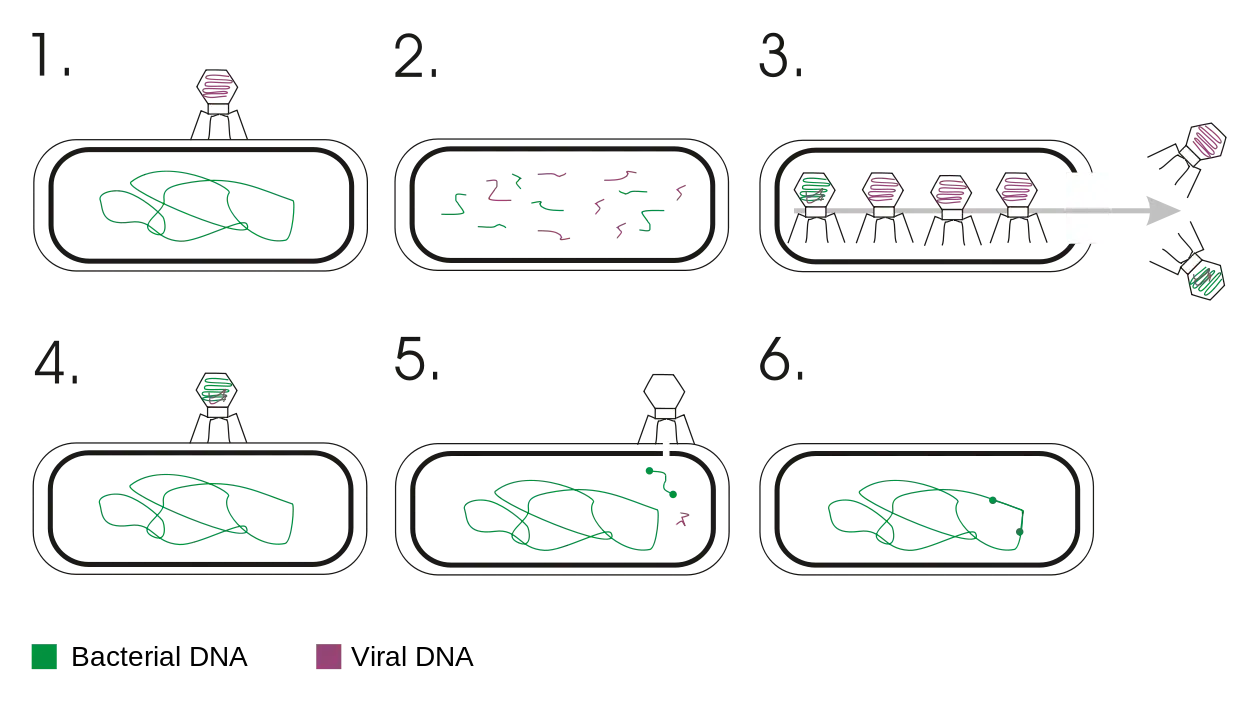Transduction occurs when fragments of the bacterial chromosome accidentally become packaged into viral progeny produced during a viral infection. These virions may infect other bacteria and introduce new genetic arrangements through recombination with the new host cell's DNA. The closer two genes are to one another on a chromosome, the more likely they will be to transduce together. This fact allows geneticists to map genes to a higher degree of precision.