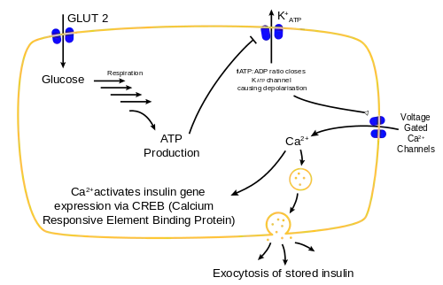 Mechanism of insulin release in normal pancreatic beta cells. Insulin production is more or less constant within the beta cells, irrespective of blood glucose levels. It is stored within vacuoles pending release, via exocytosis, which is primarily triggered by food, chiefly food containing absorbable glucose. The chief trigger is a rise in blood glucose levels after eating
