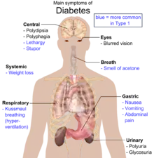 The classical symptoms of diabetes are polyuria (frequent urination), polydipsia (increased thirst) and polyphagia (increased hunger).[24] Symptoms may develop rapidly (weeks or months) in type 1 diabetes while in type 2 diabetes they usually develop much more slowly and may be subtle or absent.