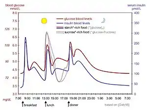 The fluctuation of blood sugar (red) and the sugar-lowering hormone insulin (blue) in humans during the course of a day with three meals. One of the effects of a sugar-rich vs a starch-rich meal is highlighted.