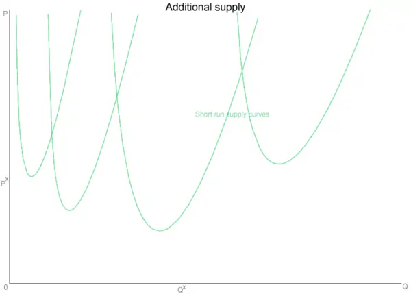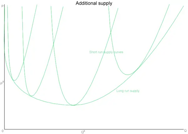 Growing firms add capital - often in the form of factories or machines - to increase their output. However, additional capital do not act the same as the original set of capital. At first, added capital may greatly increase productivity. However, additional units of capital become less cost-effective because of diminishing marginal returns, increasing costs, and loss of efficiency. Hence the latter short run supply curves begin to shift upward. In the graph, additional units of capital introduce new supply curves shifted rightward from the previous ones.