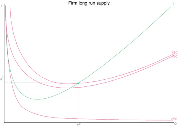 Long term, the firm produces at the point where marginal cost (and hence supply curve) intersects average total cost because at any higher point additional firms enter the industry and at any lower point the firm will earn negative profits (to be discussed later). This position is represented by the green point at Q*, equilibrium quantity. Extending this point to the y axis, we call this price P*, equilibrium price. The firm has to consider its fixed costs, which it satisfies at this level of output and price, along the green supply curve.