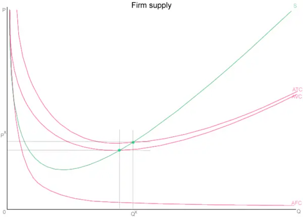 The minimum position at which the firm will produce instead of shutting down is shown by this alternative green point along its marginal cost / supply curve, where it intersects average variable cost. If a firm cannot sell for as much as what it costs to produce that additional unit (ignoring the fixed cost, which is unavoidable in the short run), and the units before that are unproductive as well, then the firm will close down and choose to suffer the fixed cost and not incur additional expenses from operating.