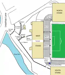 Because the match was hosted in a neutral venue, different sections of the stadium were allocated for supporters of opposing teams. The west and north stands were reserved for Liverpool fans.[4] To enter the west and north stands, Liverpool fans first needed to pass the temporary perimeter gates near Leppings Lane. From there, they proceeded through the stadium entrance which consisted of a limited number of turnstiles.