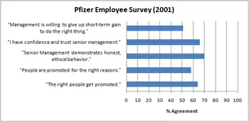 After being demoted by Pfizer in 2003, Rost decided to launch a personal attack on the company. He compiled data, specifically highlighting areas with which employees did not agree. The graphic to the right displays these percentages.