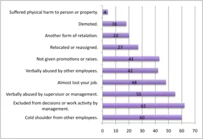 Research has shown that there are generally very negative consequences for those who report their companies' violations. The chart to the right shows some of the repercussions whistleblowers have experienced as a result of their actions. In addition, a 2009 study at the University of Richmond uncovered more details about the adverse affects of workplace whistleblowing. The study revealed that 78% percent of whistleblowers felt distrust towards coworkers, while 84% experienced anxiety or depression.[13] These impacts are difficult to quantify because they are not as concrete as others, such as demotions or firings. The study concludes that existing whistleblower laws allow for some protection, but they do not go far enough, "They [current laws] allow employers to use non-workplace-related retaliation to silence whistleblowers as most existing laws only cover workplace-related retaliation. Lawmakers need to fill this void so that legitimate whistleblowers will be encouraged to reveal dangerous behavior that harms the public".[13]