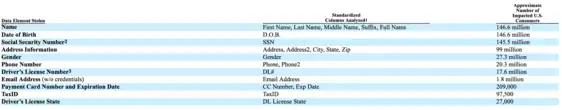 The Equifax data breach initially affected 143 million Americans whose data was stolen.[4] This number was later revised to 146.6 million , which constituted 44 percent of U.S. population.[5] Stolen information ranged from full names and date of births to social security numbers and driver licenses' information.[6] A survey conducted by CreditCards.com found that "twenty percent of all respondents have heard little or nothing about the Equifax breach, including 46 percent of those aged 18-37" and that 50 percent of surveyed adults did not check their credit scores and reports after the breach.[5]