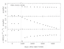 The Figure shows a typical glitch. The x-axis for all panels represents time and the vertical dotted line indicates the time at which a glitch occurred. The top panel shows the change in the pulse frequency with respect to the timing model parameters before the glitch. Clearly a sudden change occurred during the glitch in which the pulse frequency increased by ~20μHz. The scaling in this plot does not allow the viewer to see small changes. The central plot is therefore the same, but the mean Δν before and after the glitch has been separately removed. This figure indicates a long term (many thousands of days) decaying signal. The bottom panel shows how the spin-down rate is changing.
