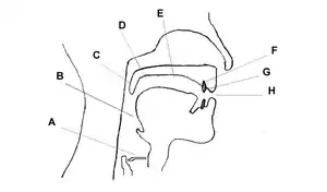 - Glottal : articulated with i.e. by moving glottis (see A in figure), /ਹ/ is the only glottal sound in Punjabi.