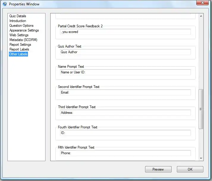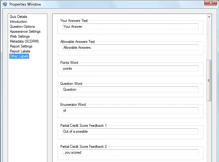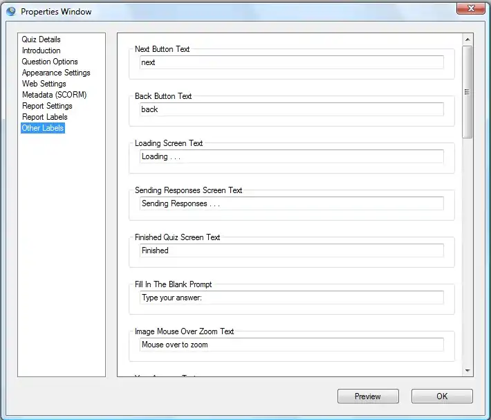 This section allows you to customize other text labels giving you the maximum opportunity to personalize your quiz.