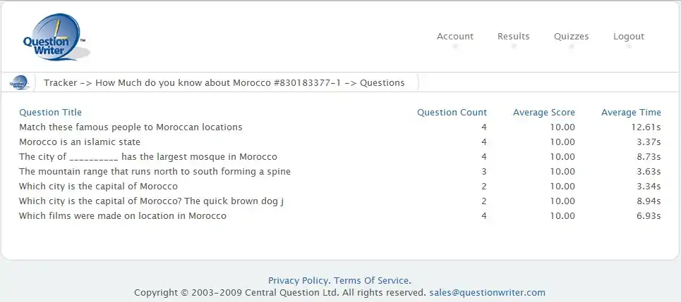 You can delete a quiz by clicking on the red cross beside the name, or you can click on the white question mark in the dark blue circle and see a list of all the questions in that quiz along with some statistics on the scoring for that question.