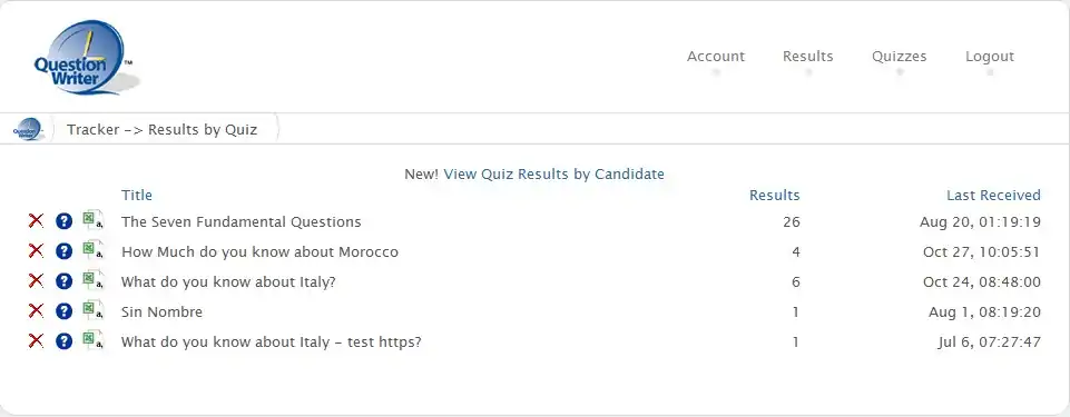 You can also see all results for a particular candidate by clicking on View Quiz Results By Candidate at the top of the main results page. This will give you the view of the candidates who have taken quizzes, the number of result sets, and the date the last set of results was submitted. Clicking on a candidate's name takes you to a page with the list of quizzes with the summary of results and dates/times.