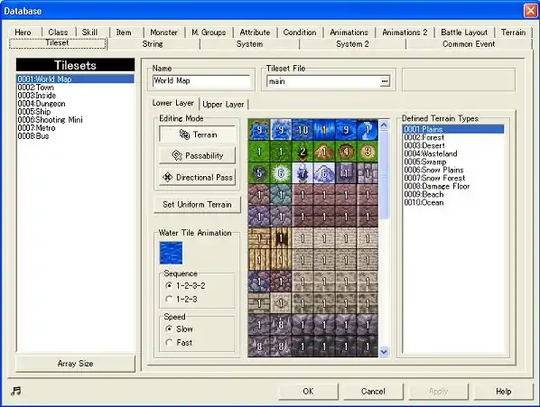 The water tile animation area is for the water tiles animations, obviously. You can set how it will be animated, and what speed it should animate at. It will show you a sample tile above it, so you can see how it looks.Now it's time to see the upper layer tab. It's a LOT more simple than the lower layer, and most of the functions are the same, so less explaining is a lot more necessary!