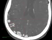 - Controversies-- Given the increased use of cranial imaging estimates are that 50-60% of newly diagnosed AVMs are detected incidentally. Although the traditional stated risk of hemorrhage is 2-3% per year, this is typically calculated from the time of diagnosis. More recent estimates place the risk of hemorrhage at closer to 1%. Predictors of AVM hemorrhage include increasing age, deep brain location, associated aneurysms, and deep venous drainage. This has led to: ARUBA (A Randomized Trial of Unruptured Brain Arteriovenous Malformations), a multicenter randomized trial enrolling 800 patients, that compared treatment (sugery, radiation, or both, physician decision) of unruptured lesions with conservative management. Randomization was ended early because of increased risk of stroke and death in the intervention group.