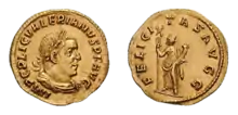 Gold coins were rare during the Roman Republic. The aureus (from Latin aurum-"gold") was not a regularly minted coin until the time of Julius Caesar.[6] The aureus had a value of 25 denarii.[5] As with the denarius, the aureus did not survive into the Late Empire. It was replaced by a coin known as the Solidus, said to have a value of 1000 denarii due to the debasement of the denarius' value by that time.[7]