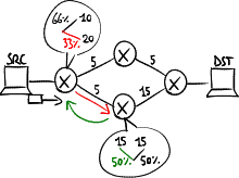 the router may decide to send the packet with 66\% probability along the primary path and 33\% probability along the secondary path.