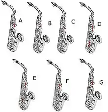 The saxophone should be held as follows. Place your left thumb on the thumb rest under the octave key (the key that's facing towards you and controls the pad on the neck of the saxophone). You should be able to easily slide your thumb upwards and press the octave key. Place your first three fingers on the B, A, and G keys (respectively). In the right hand, place your thumb under the thumb rest so that some of the weight of the instrument rests on your thumb. Then place your first three fingers on the F, E and D keys (respectively).