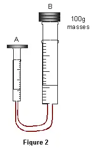 With syringes of different sizes it is possible to demonstrate how to multiply force [see figure 2]. A small mass on a small syringe can lift a much larger mass if it is resting on a bigger syringe. This is because the pressure in the two syringes is equal, but the surface areas of the two pistons are different, and force = pressure × area.