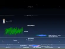 - Upper atmosphere where atoms are ionized by solar radiation (electrons are added or removed, resulting in charged particles). Aurora borealis