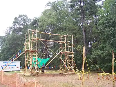 With a group of Scouts, OR on your own, select a pioneering project and get your counselor's approval before you begin building. Your project must not result in anyone reaching a height of greater than 6 feet off the ground. With your counselor's guidance, create a rough sketch of the project. Make a list of the ropes and spars needed, then build the project. (Note: This requirement may be done at summer camp, at district or council events, or on a troop camp outing.)