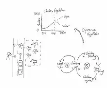 - A causal loop diagram of chicken population growth dynamic with variables, polarity, feedback loops, and delays.