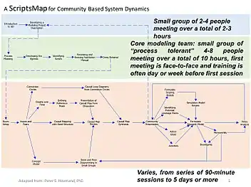 A "ScriptsMap" is a tool for sequencing individual scripts into a well-coordinated plan for a group model building workshop. It serves as a framework for "effectively combining particular sequences of scripted activities, products, and deliverables into a formal network" which facilitators can utilize to design appropriate and effective workshops based on their desired outcomes (Hovmand et. al., 2011; Ackermann et. al., 2010).