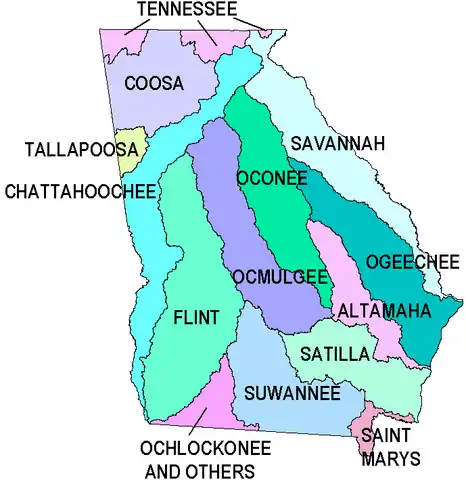 Atlanta has a Humid Subtropical Climate which seasonally ranges from lows of -9 C to highs of 36 C (16-97 F), with extremes of -23 to 41 C (-9 to 106 F). The area us crossed by several river basins, primarily the Chattahoochee by flow volume, and gets an average of 1.26 meters (50 in) of precipitation. Many parts of the area are served by public water supply networks, so water supply is generally good. Atmospheric pressure is mainly determined by ground elevation, which ranges from 175-550 m (570-1800 ft). Reference pressure is therefore 2-5% below sea level. Weather extremes can raise or lower the pressure by up to 2.8% from the reference value, but more typical weather variations are 1-1.5%.