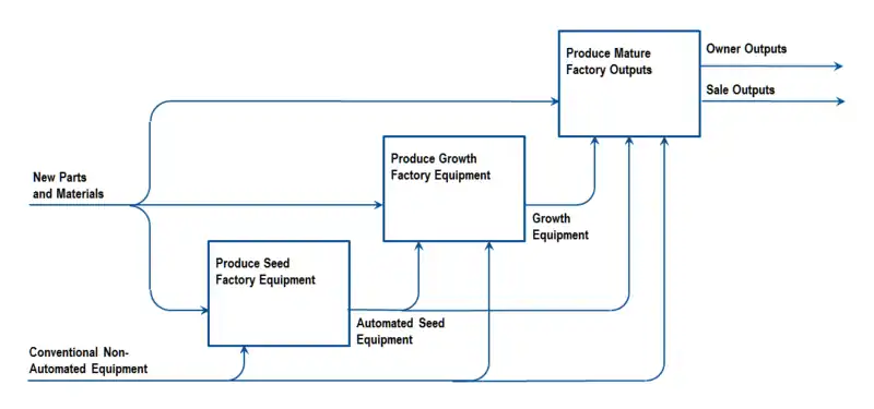 The expansion would lead to a set of "seed machines". These are intended for making more equipment, rather than end-items for personal use. This starts a transition to internal self-expansion, rather than purchasing all needed tools. The first seed machines have to be purchased, supplied from the R&D phase, or built from R&D designs using previous equipment in the project. Later machines can use parts made internally with the earlier ones. This starts building a capacity to bootstrap further growth without needing to buy everything.