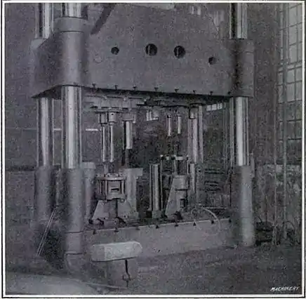 - (6) Hydraulic Press - A hydraulic press can perform tasks like pressing shapes using dies and molds, shearing, rolling, bending, and shaping. One or more hydraulic pistons force the upper plate down, while several posts keep it parallel to the lower plate (Figure 2.1-7). The upper and lower plates are slotted to accept different inserts, and side supports can feed long objects for shearing, rolling, or bending. Thin or soft materials can be pressed at room temperature, while thick metal can be pressed hot, a process called Forging. In some cases the inserts would be heated, but they must use a higher melting material than the piece being worked. Like the machine tools, presses come in a variety of sizes and load capacities.