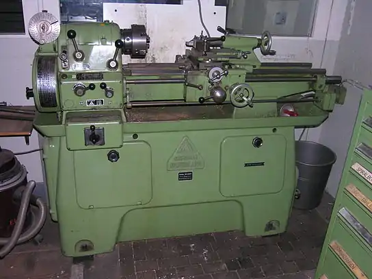This is designed with 4 parallel fixed rails. Two rails hold the main spindle/chuck with drive motor, tailstock or secondary spindle, and any intermediate supports. The workpiece is held by the main spindle and some combination of the other supports. The other two rails support a moving cross-slide, turret, or milling head as needed. Whichever is not needed is stored at the rail ends. Tool changers are located above the main work area with a supply of different tools and attachments as needed. Since the four fixed rails are solidly attached to each other, highly accurate machining can be performed. Figure 4 shows an older horizontal lathe with the spindle and chuck on the left, tailstock on the right, and cross-slide on the front face. This version has two fixed rails, while the proposed design places the cross-slide and other attachments on additional rails so they can be parked or used as needed.